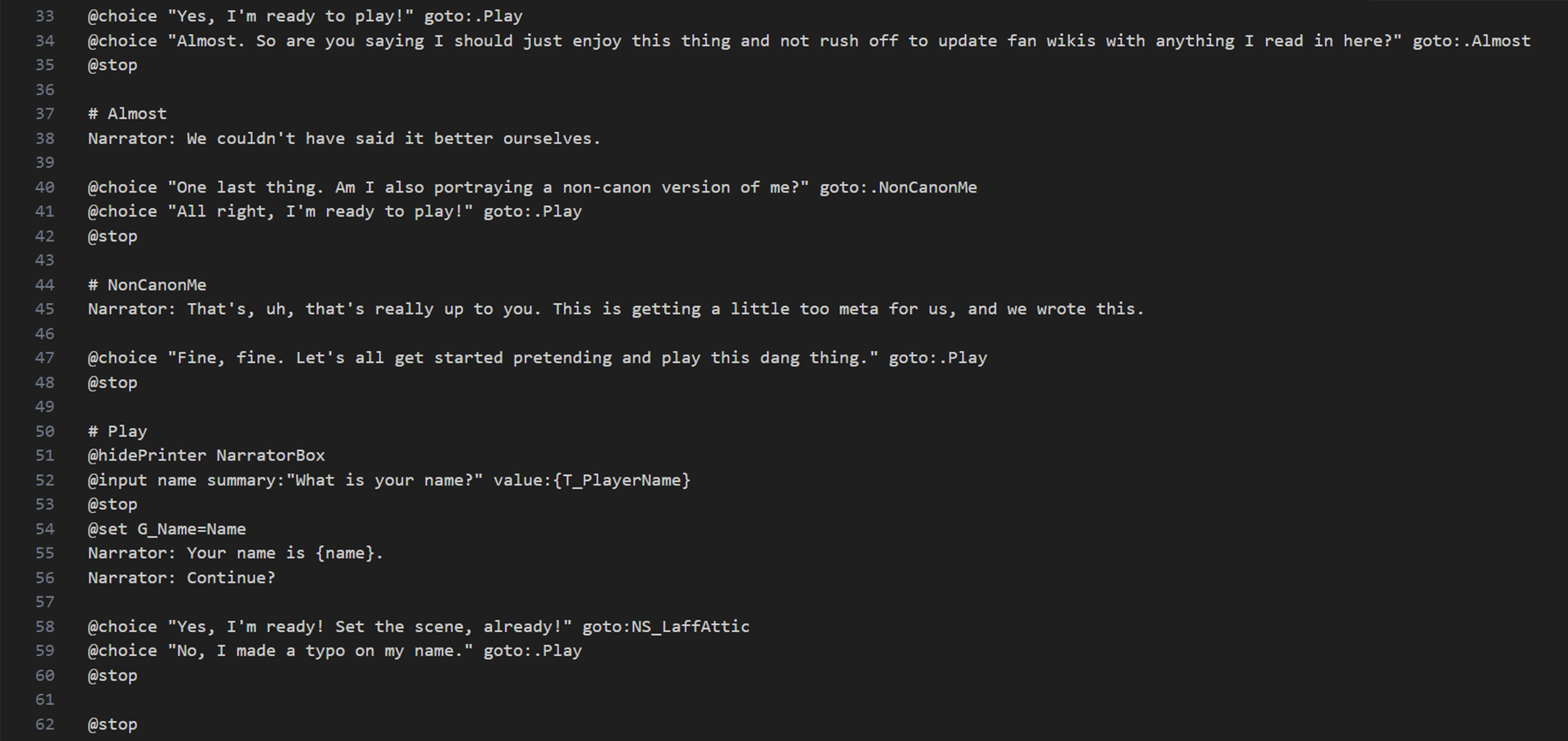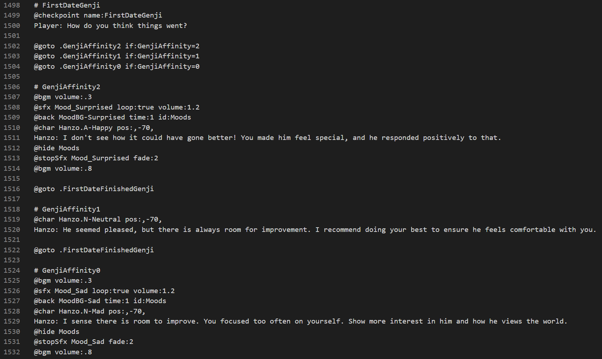 The narrative implementation process was a bit different this time around. Instead of assembling the narrative on Miro, I was given a first draft of the script that Blizzard wrote via Twine. I would then take the information presented (branching paths, dialogue, narration) and write it into the Unity script directly.