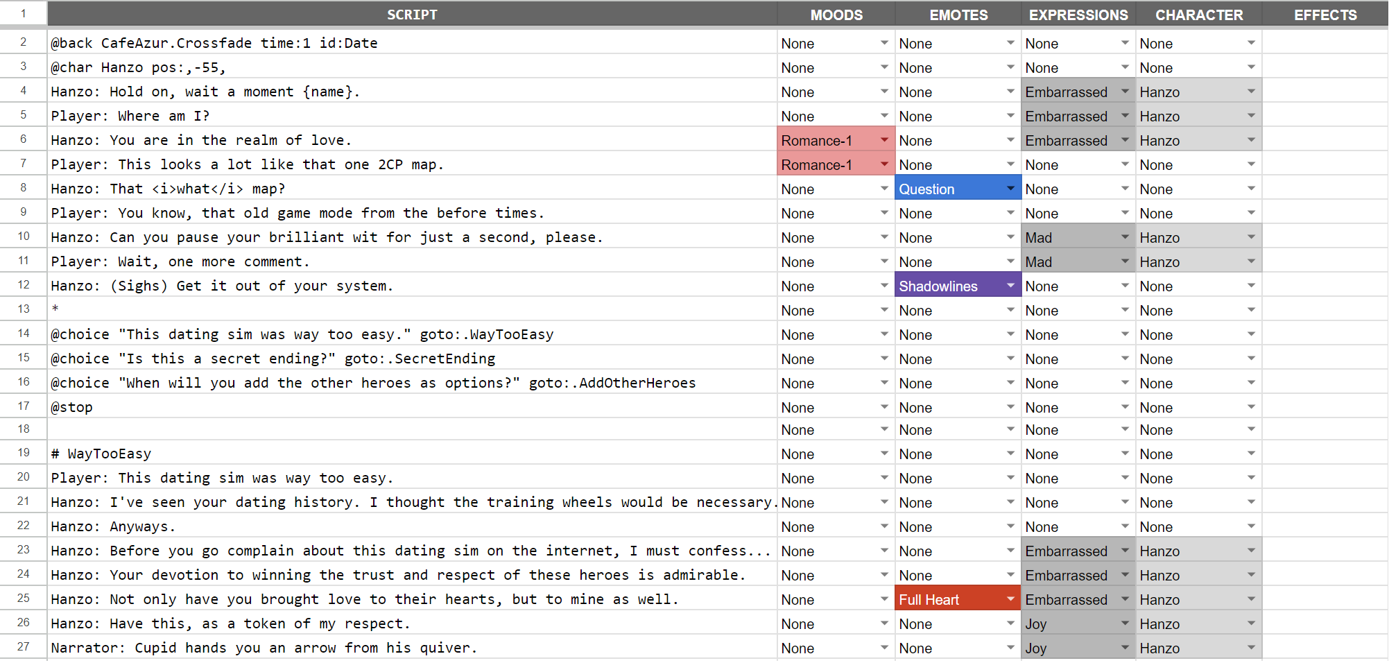 I reprised my role for Hooked on You when it came to art implementation, but from a more directorial position. I still personally blocked out all character expressions, poses, and moods to capture the emotions of the characters. Since I already had a lot of work on my plate, I had to delegate large swaths of art implementation to my team. I created a google sheet that outlined each scene's line by line script and had dropdown tabs identifying where certain art should be implemented. This way I could be assisted by my team and still decide where things like emotes, moods, and asset pop-ins should appear.